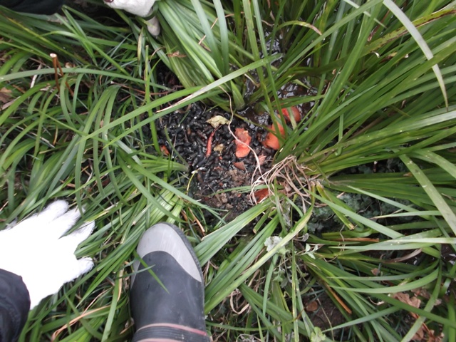 写真右 ランド内の水辺に繁茂しているセキショウ(石菖)の株間に大量の殻を噛み砕かれたカワニナの死骸とニンジンの切れ端を発見 死骸は500匹以上。