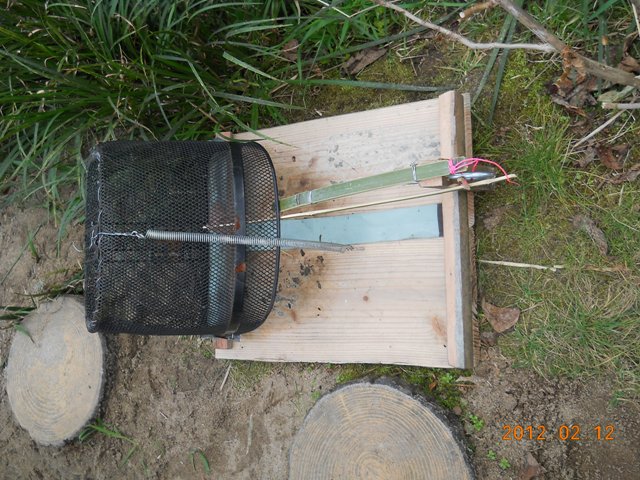 写真右 自転車の前かごを利用した自家製の捕獲装置(2012.2.11)