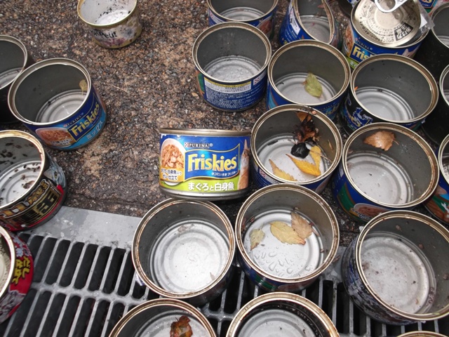 最近特に、ねこの餌缶が多くてびっくり、ねこに餌を与えるのもどうかと思いますが、それを道路に棄てていくのは許せないですね。
