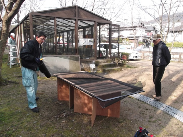 市役所環境政策課より、予てからお願いしていた網戸の交換・修理を本日行うとの連絡があり、我々宝塚エコネットは午前8時半に現地集合。