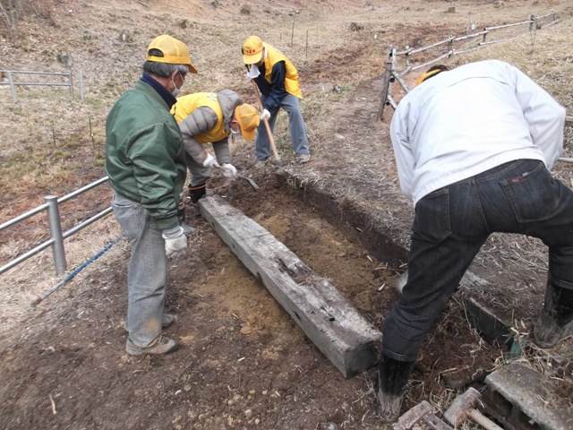 昼食後、かまどのあと地に枕木を入れて整地をしました。枕木は