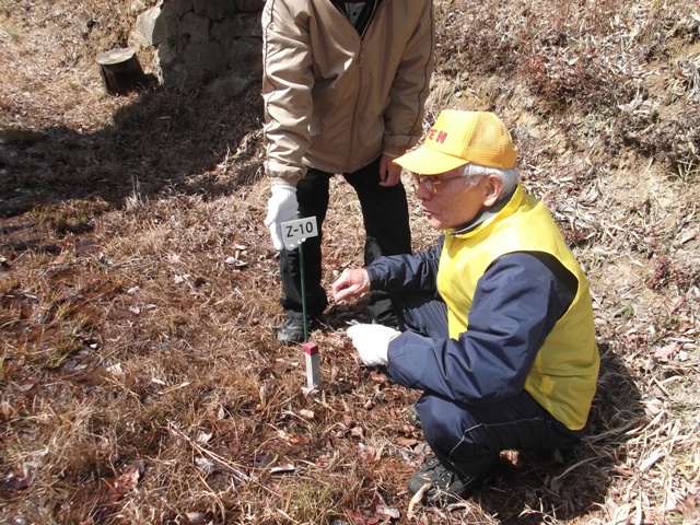 今年度最後の松尾湿原保全活動です。準備体操後、作業開始しました。植生調査はシュウジョウバカマの花が咲いていないので中止しました。午前中2班に分かれて作業しました。1班は昨年4月8日に切り倒した檜をチェンソーで小さく切り(右上側写真)、枝を払い山道に下ろし、一輪車で下へ運搬しました。もう1班はかまどの基礎部分を撤去しコンクリート片、石の搬出をしました。途中休憩して伊藤さんの奥さんの手作りのキンカンの甘露煮を頂きました。大変美味でありました。ごちそうさまでした。自然の家周辺はまだ寒いのでツクシが出始めたばかりでした。女性会員が3本採りました。