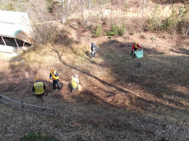 刈り取られた70〜80㎝ほどの枯草を、11名の会員が一斉にかき集め袋に詰め込み、運びだし始めた。
