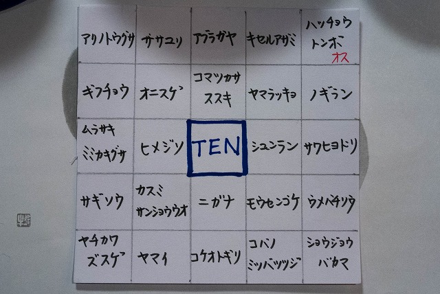 写真右 山本さん手作りのビンゴカード (20種類の手作りのカード用意 されていました。ご苦労様)