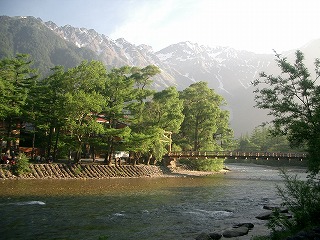 いつもは人であふれている河童橋、早朝のため観光客も少なく、