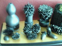 (%ショボ男%)もちろん失敗もあります。でも、成功して可愛い炭ドングリや炭キンカンを見るといとおしくなります。そこで、これを何とか作品にできないかとIさんは考えました。創意工夫の末、クリアケースに入った「華炭(はなずみ)」が誕生したわけです。