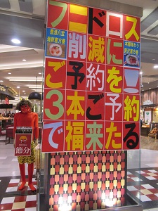 スーパーの看板には節分の巻きずしのこと「フードロス削減にご予約を。3本ご予約で福来る」だって。