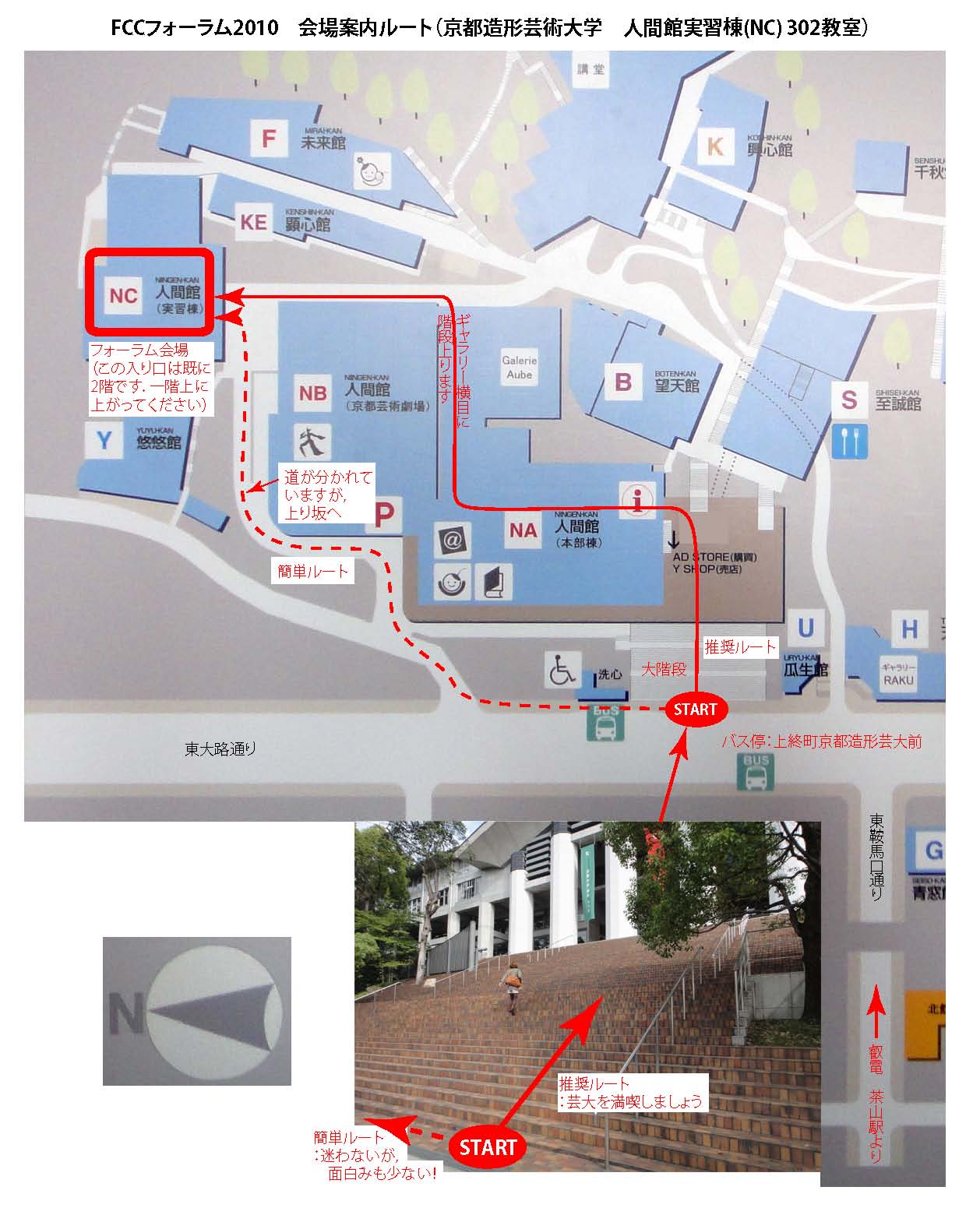 FCCフォーラム2010 「現代土木は芸術の対象になりうるか?」を今週金曜日に開催しますが,会場となる京都造形芸術大学は,たくさんの建物の集合体であり,かつ瓜生山の斜面にあります.このため,フォーラム会場となる「人間館実習棟(NC) 302教室」へたどり着くのに苦労される方もおられるかと思いますので,京都造形芸大の入り口である「大階段」下から会場までのアクセスをまとめました.