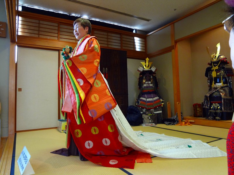 昔は肌着なしでいきなり、胸上まである袴をつけるそうですが、体験では肌着を着け袴をはきます。後ろ迄引きずるのですが本当はもっと長いそうです。裾を引っ張って歩くのはコツがあるそうです。