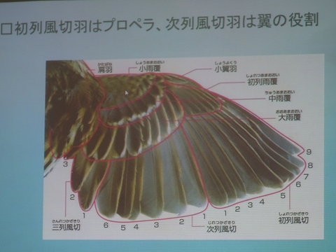 また翼の半分より体寄りの「次列風切」という羽があり、翼のはばたきに際して上下動が少なく、飛行機の固定した翼と同じように「揚力」を生み出すと考えられているようでした