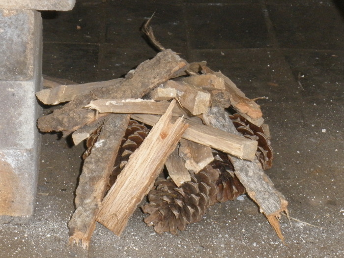 今回は初の試み、乾いた松かさ3個の上に、細く割った薪を数本乗せ、着火してみました。