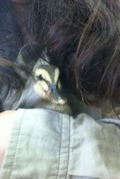 ガーデナーさん達の足を、親だと思って後をついて来てたカルガモの
