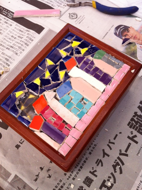 まずは先生の下絵に従って、タイルを切ったり砕いたりしながら