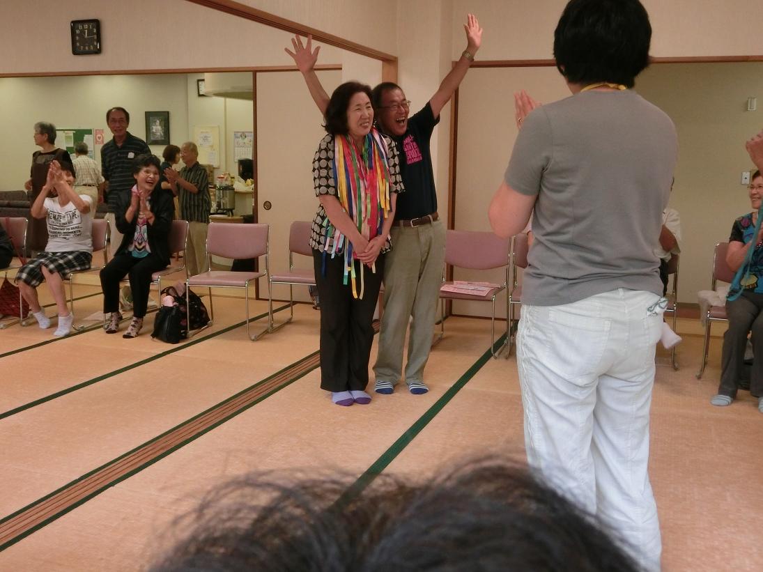 「ハイ」と声かけする積極的参加型。最初に当たった方は椅子から立ち上がって飛び出して「ハイ」をアピール。拍手喝采を浴びました。「ハイ」に当たった人も当たらなかった人も大笑いできましたね。(%笑う女%)(%笑う男%)(%笑う女%)(%笑う男%)