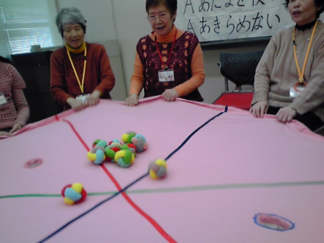 最後に感想を聞きました。初めての方は、「とても楽しかったのです」の後に、「最後のシーツ玉入れをしていたら更年期かもしれないけどのぼせたようになった」と言われたので、刺激が強かったのかな。脳が活性化した結果かな。でもまた参加してくださると言って頂きました。