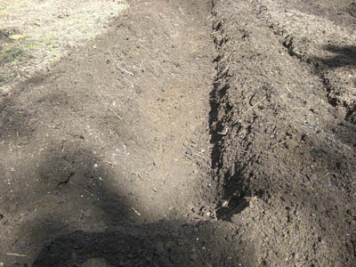 まず耕す畑に石灰を撒き、畑の真中を割って深さ40〜50cmの溝を掘ります。溝の中には畑の周辺で刈り取った雑草を足で踏み固め、出来るだけたくさん詰め込みます。
