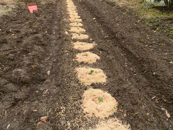 今冬は例年よりも寒さが厳しいようなので定植後は周囲にもみ殻を敷きつめ(写真上)、さらに不織布で畝全体を覆って越冬させます。(写真下)