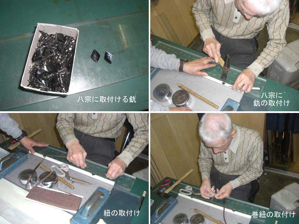 総裏打ち、それに裏摺りと耳スキが終わった作品に、掛け軸仕上げの最終工程となる「八宗・軸の取り付け」から「紐、巻紐の取り付け」を見学(撮影)しました。