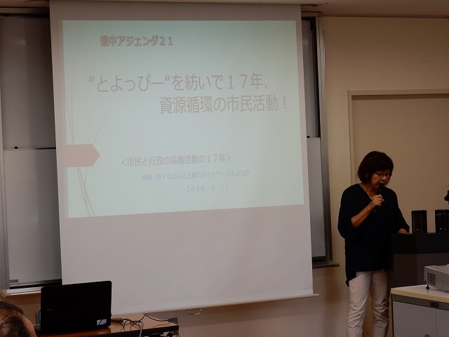 続いて事務局長から「とよっぴー」が誕生した歴史や市との協働の関係性あるいは食品のロスをどのように少なくするかの観点で、当法人の諸活動全体をお話しました。