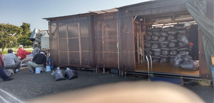 作業スタッフは最低でも(ホッパーの出口堆肥を押し出す係、堆肥を袋で受ける係、それを紐くくる方へ運ぶ係、紐くくりの係、倉庫へ運ぶ係、倉庫で積み上げる係)と複数が必要な係もあります。