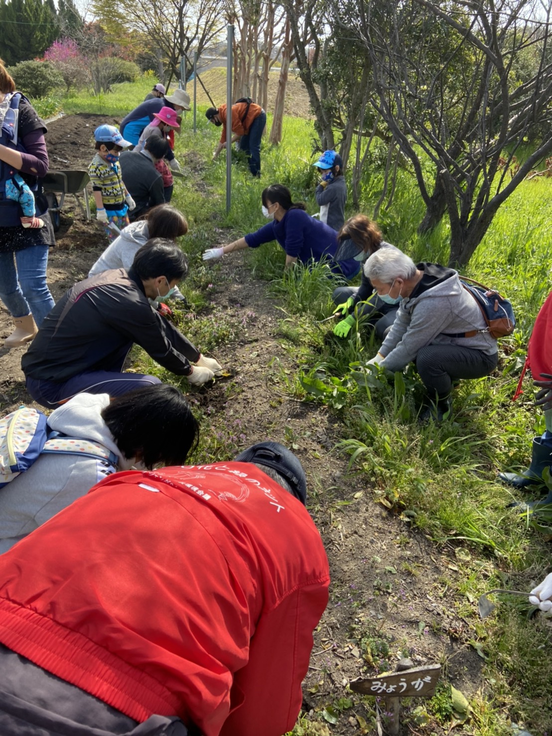 最初に施設(堆肥の製造)の説明を行い、2班に分かれて農園での草刈り作業など、春夏野菜の栽培準備を行いました。