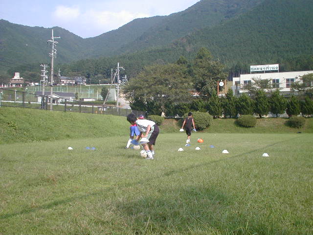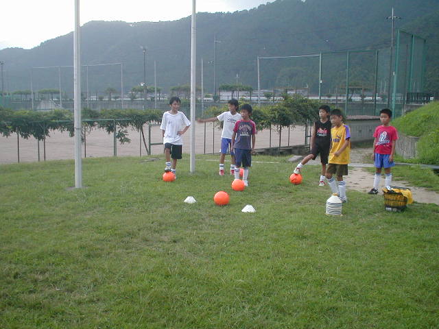 練習は先週と同じようにマーカーを拾ってどっちのほうが多いか勝負をしたのですが、今日はそれをドリブルでやるようにしました。学年ごとの勝負をして多く集めたほうが勝ちというルールにして30秒間の熱戦を繰り広げてくれました(%ニヤ男%)