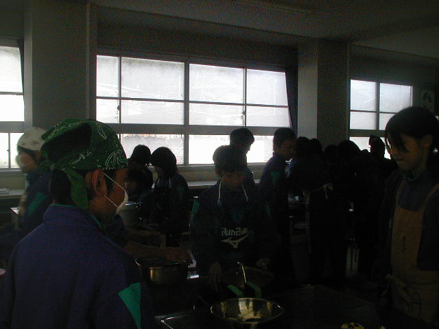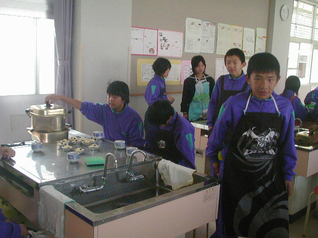 下駄箱の向かいの調理室で家庭科の授業をしていた1年生の1組は、智貴くん、悠平くん、藤田くん、森野くんの4人がいました。みんな自前のエプロンをしてとても似合っていました。今日は蒸しケーキを作っていたようで4人は違う班でしたが、味はどうだったのでしょうかね?(%ニヤ男%) ちょうど仕上げの時間だったのですが見た目はとてもおいしそうでした(%笑う男%)