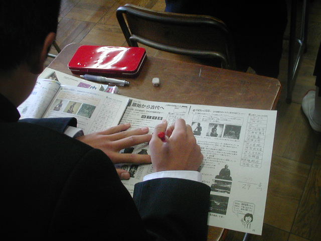 2年生の祥二郎くんは社会の授業でした。テストをしていたようで、用紙を見ると29点満点のテストでした。隣の子と交換をしてお互いに採点をするもので、祥二郎くんの見ていた隣の女の子は見事29点のパーフェクトでした!(%笑う男%)(%王冠%)