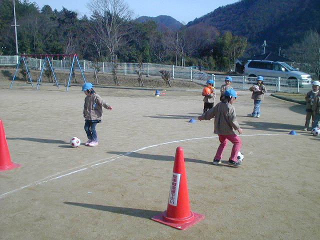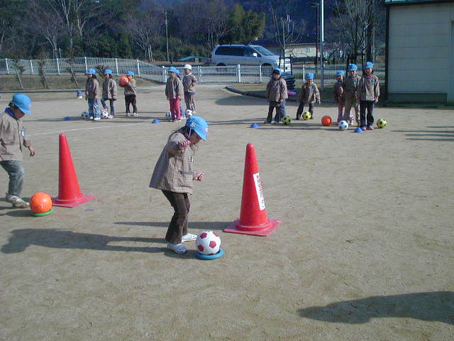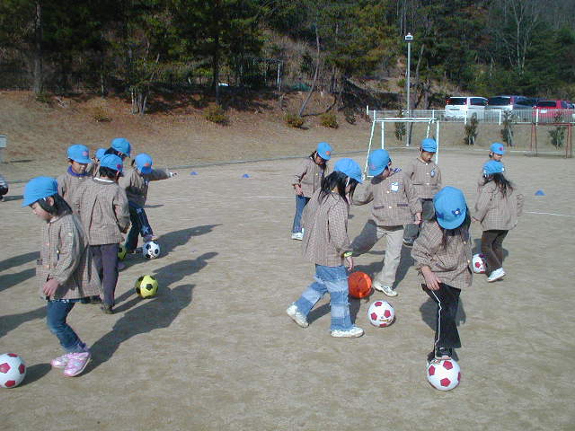 みんな始めてから一ヶ月足らずで、しかも週に一回しかしていないのにものすごい上達でした(%王冠%) ボールが自分の足元にしっかりとある状態で(写真でも分かるかと思います(%笑う男%)) 最初は『蹴ってしまう』→『運ぶ』事の変化を見せてくれました。非常にうまく運んでくれていたし、これがサッカーで言うドリブルの原点ですね(%笑う男%)
