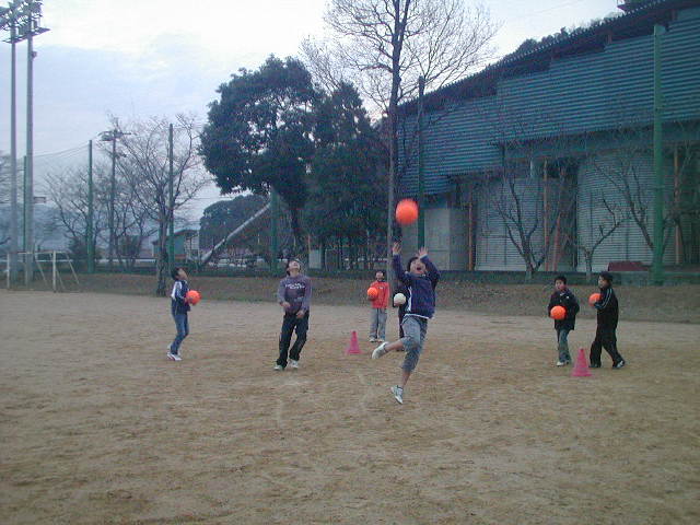 この後に、同じ形で、キックしてからキャッチをするゲームをしました。こちらは飛距離が投げる時に比べて随分と増えたのでしんどさも増したようですが、少しでも前に行こうとする気持ちが出せていたのでゲームも盛り上がって良かったと思います(%笑う男%)