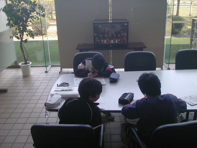 竹内くんはほんの少しだけ遅れたのですが、1時からスタート出来ました。各自でしたい教科をやるようにして、コーチも一緒に考えたり考え方を教えたりしました。分からない所をお互いに教えあうのはいい事にして、自分で簡単に答えを見るのだけはやめよう!と言ってやりました。答えを見て写すだけでは、1分間も覚えていないと思います(%痛い男%) それでは宿題も勉強もやった意味がないので、時間を掛けてもいいからしっかりと自分で分からない所の答えも書けるまでやるようにしました。最初は1時間ぐらいでいいからがんばろう!!とスタートをしました(%ニコ男%)