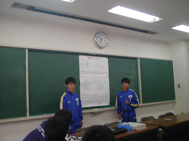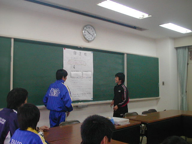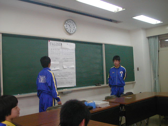 智貴くんと亮汰くんが三原則の一つである『自主性』とは何で、どうして必要なのか?を例を挙げながらせつめいしてくれました。サッカー面と生活面の両方で必要な事だし、そこを質問もしながら自分達はどう思うなどを言ってくれました。最後の質問もされないのはいい発表あったからでしょうね(%笑う男%)(%星%)
