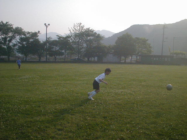 次は、同じルールですが9人いたので3人で1チームとしてチーム戦をやりました。蹴るのはチームの中で一人ずつ交代で蹴り、どのコーンを倒すかなどを戦略はチームで考えます。どれを狙おうか???など、各チームで知恵を絞っていました。学年ごとにチームを組ませたのですが(学年を分けると6年生ばかりの意見になるので・・・)このチーム分けが楽しいゲームを作ってくれたと後になって思いました。それぐらい同級生と戦術を考えてやるのが、なかなか見ていても面白かったし、いいチームワークでした。勝利したのは5年生チームでした!!うまく駆け引きをものにして最後決めてくれましたね(%笑う男%)(%星%)