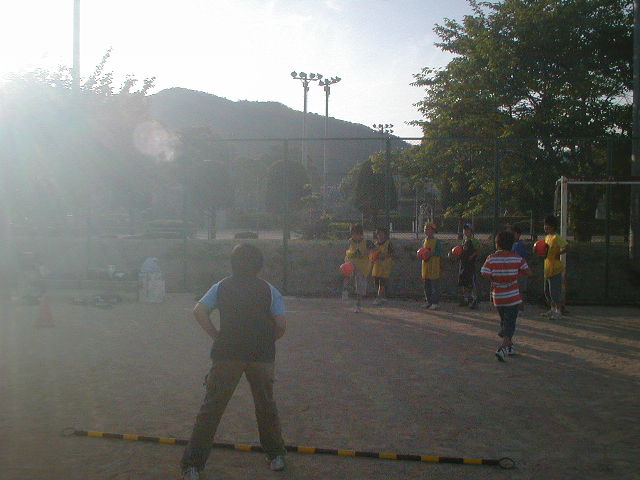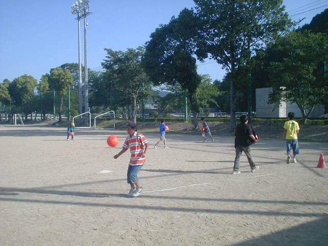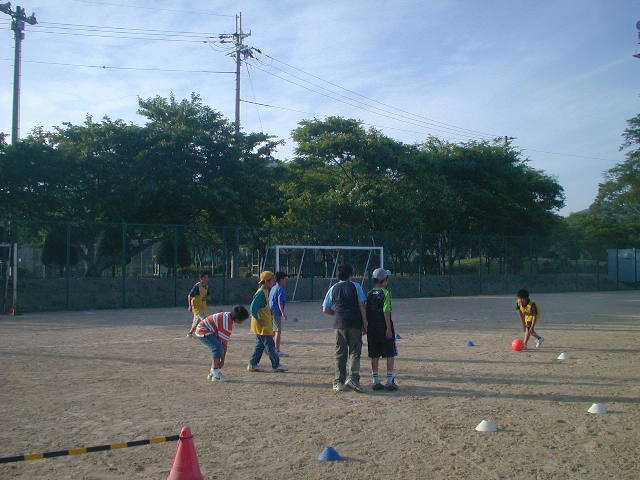 その後は4対4でのゲームをしました。これは片方が大きなゴールでやるゲームです。キーパーはボールが近くなれば誰がなってもいいルールで、その時に『キーパー!!』と言えばいいようにしています。今日はなかなか得点のお互いに入らないゲームでしたが、ファールとコーナーは全部『PK』なので、そのチャンスを生かした得点が多かったです。そんな中、今日の得点王は直也くんで、いつもは守備的なのに今日は見事なプレーを連発していました(%笑う男%) これで攻撃の楽しさも味わったと思うし、これからもどんどんゴールを狙うプレーを期待しています(%笑う男%)(%音符2%)