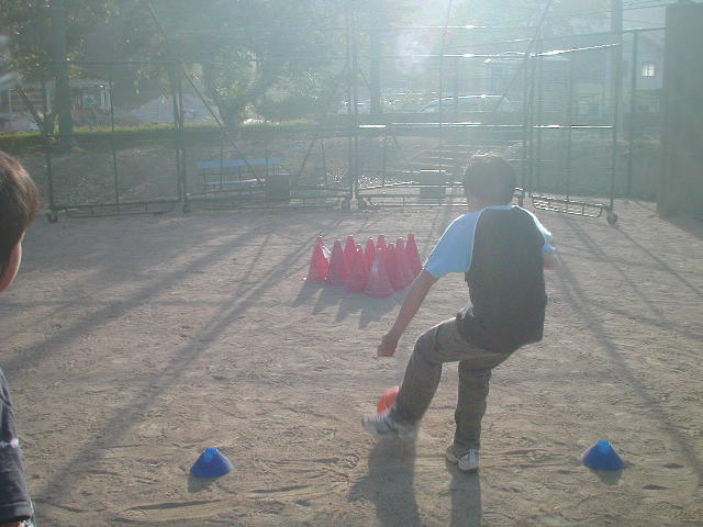 今日も晴天に恵まれた中で元気に中区スクールをスタートしました(%笑う男%) 今日は修学旅行で北小学校の6年生の生徒2人が休みだったので8人でやりました。まずは前に進むリフティングをして、自分の目標を持ってがんばります!!スクールではどこでも、このメニューをやっているのですが、前に進むという事で気持ちが前々と行ってしまう焦りでミスがどうしても多くなってしまう子が多いです・・・うまく距離を伸ばす子に共通しているのは、無理に進もうとしているのではなくゆっくりと確実にやっている、のです(%笑う男%) 慌てずにタッチする回数にもこだわりながらやってほしいと思います(%笑う男%)