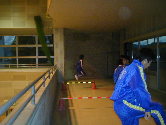 上でやったのは、同じ基礎でもコーンにバーをセットして、それを必ず一回飛んでから基礎をしました。一回ミスしたら一回プラスというプレッシャーも同時に与えてやりました(%ニヤ男%) これをヘディングまでやって、残りのクッションとウェッジは相手と少し距離を取って、その相手を一周回ってから一回やるようにしました。いわば、いつもの基礎よりも多くの動きを入れてからの基礎なので、当然負担は倍以上あります(%笑う男%) ただ、これはほんの最初だけで、後にはもっと走ったり、動いたり、ステップを入れたり、ドリブルしたり・・・と約50分間を上でしっかりと汗を出してもらいました(%ニヤ男%)