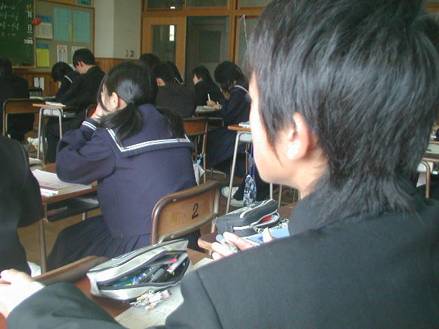 一番最初は裕哉くんのクラスに行ったのですが、ここは英語でコーチが教室に入った瞬間に向かい合うような所に座っていたのですぐに気付いてくれました(%笑う男%) 授業は英語では向かい合ってやるような形だったので写真が撮りにくい状況でした(%痛い男%) コーチがこのブログをやっている人だと知っている人ならいいですが、知らない人にしたら、『何で写真撮ってるの???中学生マニア???(笑)』と思われても困るので、撮影は自粛しました(%痛い男%) 裕哉くんはものすごく照れている感じでした。それと・・・ペン回しすぎです!!(笑)