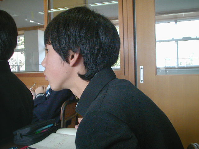 ここは数学の授業でしたが、森本くんは一番端っこの席でがんばっていました。このクラスでは、門脇先生がコーチにわざわざ椅子まで用意してくださったのでお言葉に甘えて座って見たのですが、森本くんと思いっきり隣に同じ目線で座ると何か不思議な感じがしました(笑) 森本くんは机の中の整理をもう少ししてもらいたいと思いました(%痛い男%) 身の周りの事にも気を配れるようになってほしいです!!教科書が机からはみ出すのはあんまり気持ちのいいものではないので・・・(%ニコ男%)(%涙%)