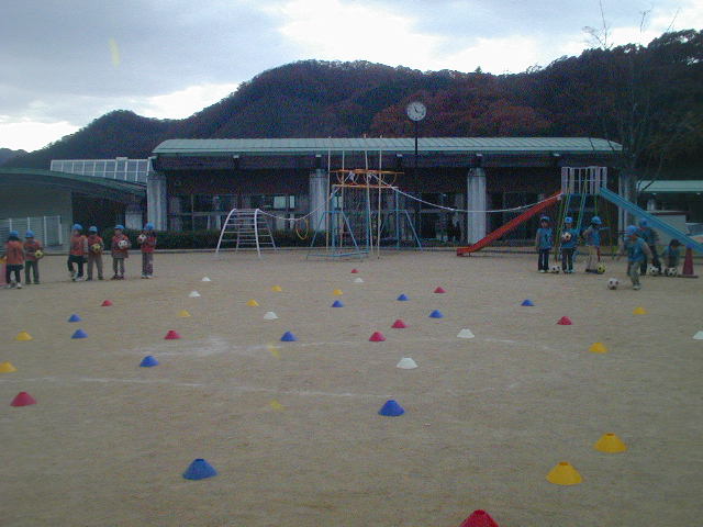もしタッチされても、オリに入って味方のみんながタッチしてくれたらまた逃げれるルールだったので、切れ間なくみんなが動いてくれていました(%笑う男%) 元気な子を狙ってタッチしたり、こそ〜っと滑り台の後ろに隠れている静かな子を狙ったり、コーチを挑発してくる子を狙ったり・・・いつものように『鬼のコーチがおちょくられている』状態でした(笑)