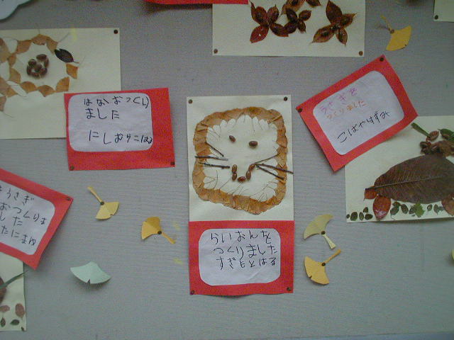 子供は感性の塊(かたまり)、といつも思いますが、このライオンを作る葉っぱの茎でしょうか?この使い方なんてすばらしいと思います。自分が作れ、と言われたらまずこの発想は出ないでしょうね・・・子供っていいな〜(%笑う男%) 自分の子供はいないけれど・・・(笑)