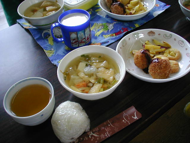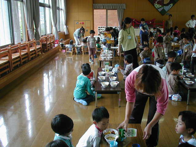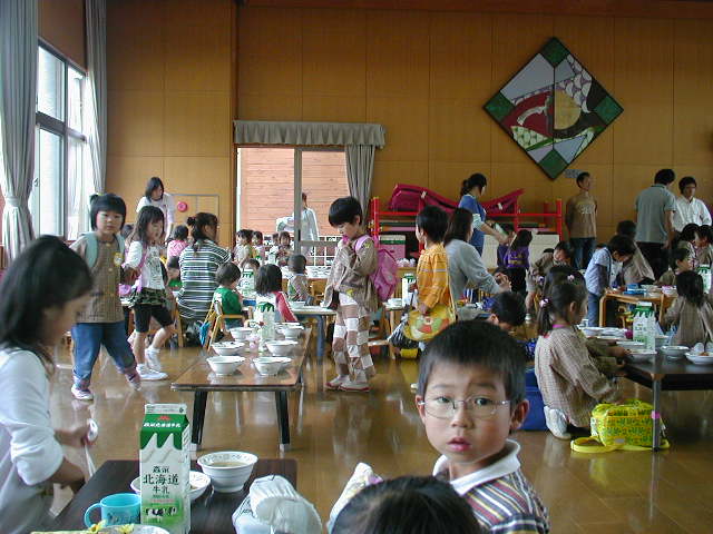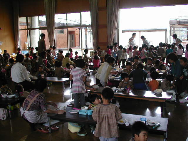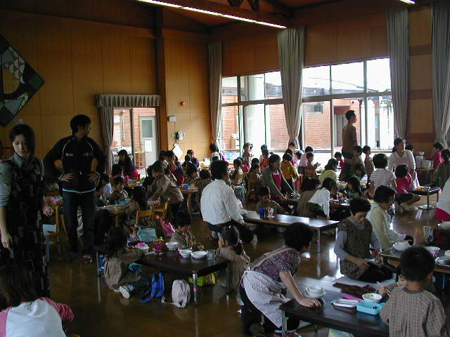 奥のほうには、本当に小さな子もいたし、みんなでワイワイしながらの食事はかわいかったですね(%笑う男%) また、それぞれの弁当箱や各自持参のご飯(おにぎり)は、それぞれの家庭の自慢のように、子供達が紹介してくれました(%笑う男%)(%笑う女%)
