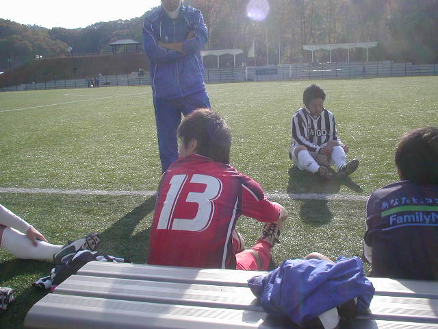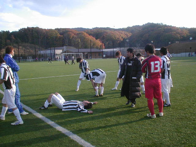 でも、そんながんばりも守りばかりでは支えきれずに相手の攻撃に対し、フリーキックを与えると、誰も動けない強烈なシュートを叩き込まれて後半半分まで耐えた守備もついに失点してしまいました(%痛い男%) それでも、一人も下を向かずにがんばり、怪我で出れない西村くんや控えの選手、交代した選手が一丸になってチームを盛り上げ、鼓舞し、全員でサッカーをしている実感がかなりありました(%笑う男%)(%星%) チャンスもあったし、ピンチにも全員が気持ちを切らさない結果が、流れからの相手のゴールがなかった事に証明されていると思う。そんながんばりもみんなが最後の一歩で凌いでいただけに、ピンチは常にありました(%痛い男%) そして、残り10分の時間になって相手のコーナーキックをこれまたドンピシャで合わせられてしまい、ついに逆転を許してしまいました(%痛い男%)(%痛い男%)(%痛い男%)