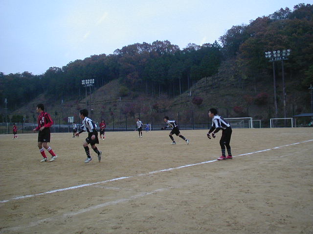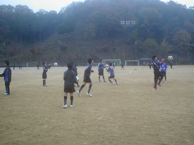 小雨が降って寒さが増してきた中でしたが、リズムを掴むと前半に森本くん、拡樹くんが追加点を挙げ、3−0で前半終了しました(%笑う男%) 展開に余裕が出てきたので、ハーフタイムには細かい部分の修正を伝え、後半は浮いたボールへの対処をチームの課題にしてもらいました。競り合いから逃げずにしっかりと競る事をやってもらい、さらにピンチをなくせるようにしました(%ニコ男%)