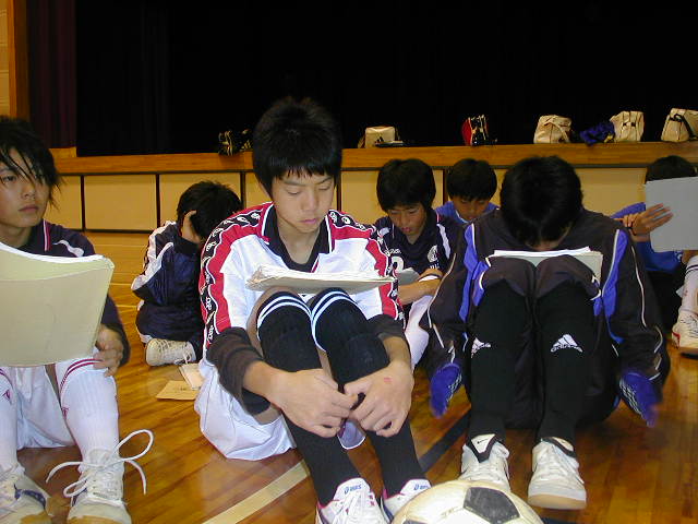 そこで、途中集めて説明をしました。3人守備がいるなら、一人は聞く(ボールへのアプローチ)、一人は指示(次を狙う)、一人は感じる(予測する)事が必要であると言いました。その後からは狙いの守備が所々見えてきたので少しは成果があったかな、と思う。ただ、これが標準となってずっと当たり前のように出来ないといけないし、1年生の理解不足が目立っていたので、チームとしてやろうとしている事に学年は関係ないので、全員が出来るように理屈でコースを消し、狙って奪える守備を出来る選手にしたいです(%笑う男%)