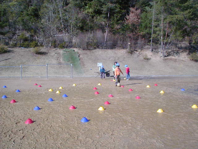 天気は最高の晴れでしたが(%晴れ%)、グランドは朝の冷え込みで凍ってしまっていたのでその凍ったグランドがだんだん気温の上昇でゆるくなり・・・(%痛い男%)(%痛い女%) いつもの時間よりも1時間早く行ったのもあって、最初のクラスはまだゆるくなってきたなぁ〜ぐらいで済んでいたのですが。。。後のクラスの時間には、もう最悪の『田んぼ状態』になっていました(%ショック男%)(%涙%)
