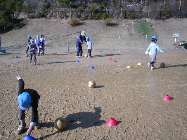 こけて泥だらけになった子もいれば、泣いた子もいます・・・。それでも、外でこうして泥まみれになって遊ぶ子供を最近見かけなくなったものです(%ショボ男%) お洒落な子は増えました。でも、それは親のエゴでもあるし、子供はこうやって大きくたくましくなっていくものだと思います(%ニコ男%) 一緒にやっている自分だって泥まみれになるし、それを嫌がったりしていると子供も元気はなくなってしまうものです。逆に一緒にはしゃいでいれば自然と盛り上がっていきます(%雪だるま%)(%音符1%)(%音符2%) 子供はどんな状況も楽しむように変化させていく力を持っています。また今日驚いたのは、男の子よりも女の子のほうが開き直りが素晴らしかった事です(%笑う男%)(%笑う女%) 汚れを気にしているのはあったけど、一旦汚れてしまえば泥の中に突っ込むのも、団子作るのも、コーチに泥をぶつけてくるのも(笑)・・・みんな女の子でした(笑)
