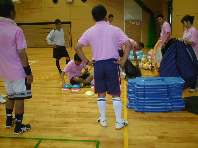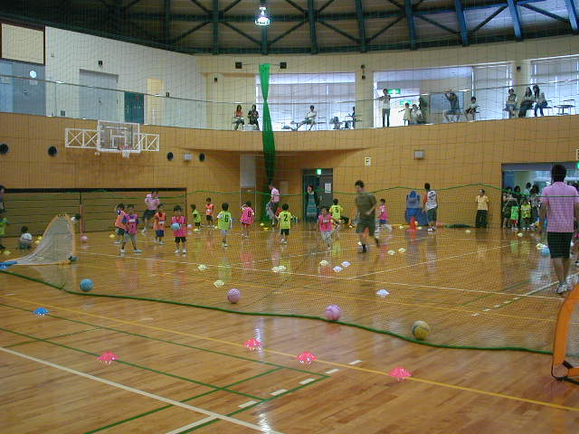 その次はボール遊びをして、ボールに慣れていきました。いろんな動作でボールを投げたり、ついたり、キャッチしたりしました(%笑う男%)(%笑う女%)(%音符2%) その次はドリブルをしながらいろんな場所でストップさせたり、コーチの合図でしっかりと止める練習もやりました(%笑う男%) 午前はこの時にうまくいかなかった反省点もあって、昼休みに宮内コーチともミーティングをして改善し、午後は見事にうまくやれました(%笑う男%)(%星%) ドリブルをした後はシュートをしました(%笑う男%)(%音符2%) ゴールに向かってシュートをしたのですが、最初は簡単に出来る所から写真のように人形があったので、それをキーパーみたいに置いて簡単には入らないようにしたり、午後の部ではこの人形をコーチが操ってみんなのドリブルを止めるように妨害するのを抜いていくような事もやりました(%笑う男%)(%笑う女%)