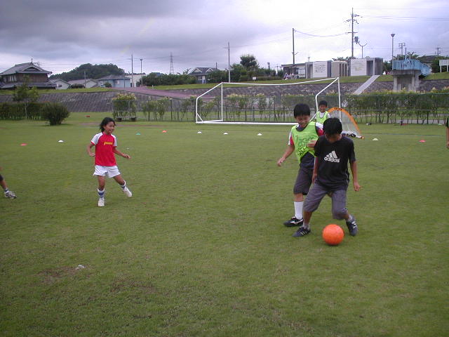 その後は、4対4で片方のチームは各自ボールを持って、もう片方のチームは中央に置いたボールを落とされないように守るゲームをしました(%笑う男%) ボールを持っている側で攻撃として、自分のボールを当てて中央のボールを落とすのが狙いでした(%ニヤ男%) 逆に守備の4人はそのボールを当てられないように守るのですが、それだけのルールにしてしまうと極端な話、4人でボールを囲めばやられません。でも、それではゲームとして面白くないので、守る4人も攻撃の4人からボールを奪って外に出すようにさせました。そうやって守りながらも攻める事、攻めは常にゴール(中央のボール)を目指す事を意識してもらうようにしました(%笑う男%)(%音符2%)
