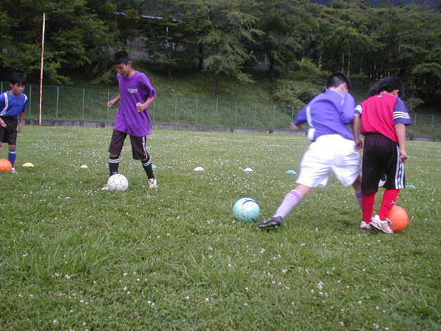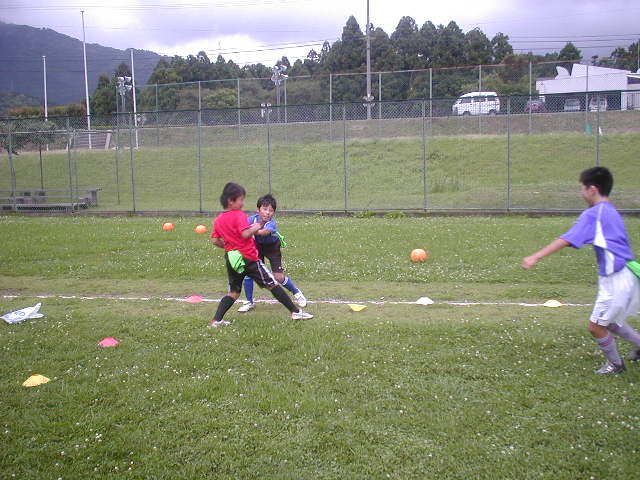 その後はボールをキープしながら相手のボールを出すゲームをしたのですが、ここでも森野くんがうまかったし、篤生くんのキープもなかなかのものでした(%笑う男%)(%星%) 2人は足元の技術がうまいし、うまくキープ出来るから相手に攻撃する余裕もあって、逆に4年生はどうしても自分のボールを守る為に精一杯だから攻撃を仕掛けるまで気持ちが回らないと言った感じでした(%笑う男%) でも、チャンスがあれば見逃さないうまさはあったし、こういうゲームでは個性とかセンスがしっかりと見えます(%笑う男%) そういうのが見ていて楽しいですね(%ニコ男%)(%星%)(%音符2%)