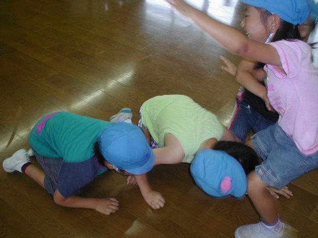 そんな状況で、スタートしました(%笑う男%) まずは子供が好きな『こおり鬼ごっこ』をしました(%ニヤ男%) これはタッチされたら動きが凍ってしまって周りの友達がタッチすると元に戻るゲームで、鬼はコーチがやりました(%笑う男%) その後、それの進化版という事でタッチされると『東京タワー』になりました(%笑う男%) 両手をタワーのように上でくっつけて、足を思いっきり開きます。そして、その股の間を誰かが通過すると復活するのですが、イジワルなコーチは、一生懸命仲間を助ける為に股の間をくぐった瞬間にタッチして、延々とそれを繰り返してタッチするズルい技を使っていたのですが、それを文句も言わずにひたすら仲間を助け、助けた瞬間にタッチされてタワーになって・・・・を繰り返してくれました(笑) 純粋だから面白かったです(%ニヤ男%) この写真は必死に助けている様子ですが、一気に何人かがくぐろうとするから、タワーをやっている子供の体が浮いてしまうような事もありました(笑)